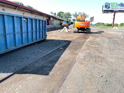 Being a beautiful (but hot!) day, I decided to go take some pictures. Here's a shot of the main building. Two tracks ran along the side, you can make out a couple of rails curving toward it. There's a second major building to the right.